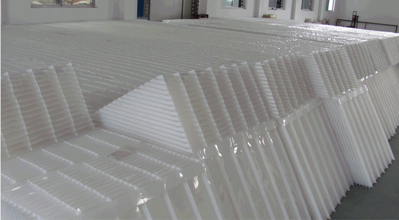 斜板填料主要由共聚及聚丙烯材料混合制成。從淺層理論的基礎(chǔ)講,在斜板上部設(shè)置沉淀距離合理的沉淀段,在下部控制斜板的幾何形狀,使斜板下部形成穩(wěn)定的接觸絮凝段,通過接觸作用和淺池沉淀機(jī)理達(dá)到礬花與水分離的目的。各種間距斜板填料均是通過不同高度的塑料肋條來支撐斜板片,肋條與斜板熱熔焊接,每兩層斜板片之間需要多根肋條支撐,組裝工藝復(fù)雜,而且傳統(tǒng)斜板內(nèi)部水流流道成矩形,常適用于上向流沉淀池。 斜板填料規(guī)格參考表(備注:斜長為1m計算) 片厚(單位:mm) 平板(單位:張) 重量(單位:kg) 肋條(單位:根) (板間距)25 0.8 32 33 7 1 32 39 7 (板間距)28 0.8 30 32 7 1 30 37 7 (板間距)30 0.8 28 30 7 1 28 35 7 (板間距)50 1 18 26 7 (板間距)80 1.5 11 25 7 (板間距)100 2 8 24 7